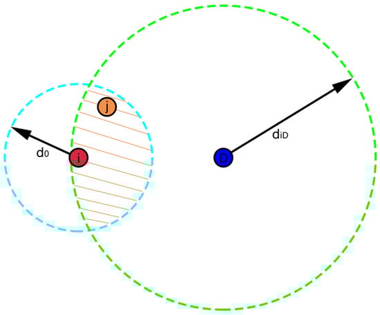 As shown in Figure 5, the two circles are made with node i as the center, as the radius, and the node D (destination node) as the center, (the distance from node i to node D) as the radius, respectively. The area where the two circles intersect is the forward transmission region. Assuming the coordinate of D is . If node j is a forward transmission node of i, it should satisfy two conditions: firstly, j is within the transmission range of i; secondly, node j is closer to the destination D than i, that is: