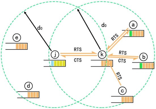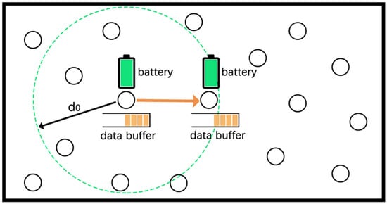 As shown in Figure 6, each node has a data buffer and a battery. Packets in the data buffer come from two sources, including newly generated packets by themselves (denoted as ) and packets received from other nodes (denoted as ). For the packets generated by nodes following Poisson process, obeying an exponential distribution and the value can be obtained by efficient prediction [].