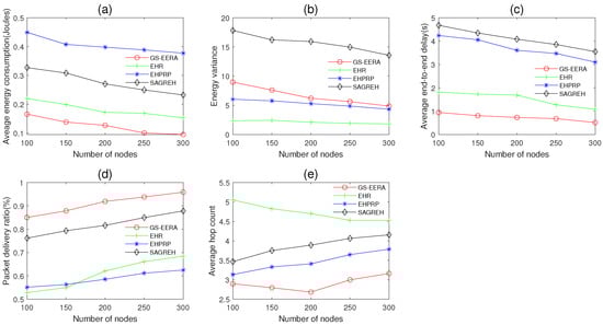 The impact of the number of nodes on (a) average energy consumption, (b) energy variance, (c) average end-to-end delay, (d) packet delivery ratio and (e) average hop count.