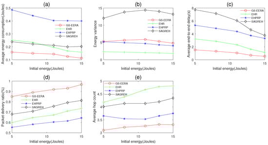 The impact of initial energy on (a) average energy consumption, (b) energy variance, (c) average end-to-end delay, (d) packet delivery ratio and (e) average hop count.
