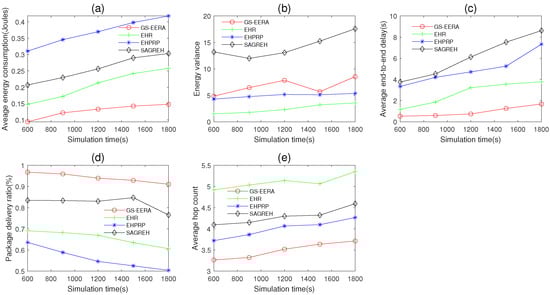 The impact of simulation time on (a) average energy consumption, (b) energy variance, (c) average end-to-end delay, (d) packet delivery ratio and (e) average hop count.
