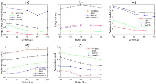 From Figure 10a,c,d, we find that our algorithm, GS-EERA, achieves the optimum performance in average energy consumption, end-to-end delay and packet delivery ratio. Take the energy consumption as the example, GS-EERA outperforms the EHPRP, EHR and SAGREH by about 193.38, 52.86 and 98.93%, respectively. The reasons can be explained as follows: Firstly, our algorithm leverages the reception state adjustment mechanism to alleviate the congestion problem, which can reduce the energy wasting, transmission delay and packets loss. Secondly, it chooses relay node based on multi-factors, which considers the residual energy, energy harvesting rate, distance and transmission delay. Thirdly, it also adopts void recovery and void avoidance methods to deal with the routing hole problem. Therefore, it alleviates the issues of packets loss, long transmission delay and energy wasting brought by routing holes. EHR considers the buffer constraint problem. However, it neglects the impact of energy state, collision of wireless channel and the routing hole problem. Therefore, EHR only slightly eases congestion, and it performs worse than GS-EERA in terms of energy consumption and end-to-end delay. SAGREH determines the candidate route based on distance, direction and residual energy, i.e., choosing a transmission path with the highest reliability. Hence, SAGREH achieves acceptable performance in energy consumption and packet delivery ratio.