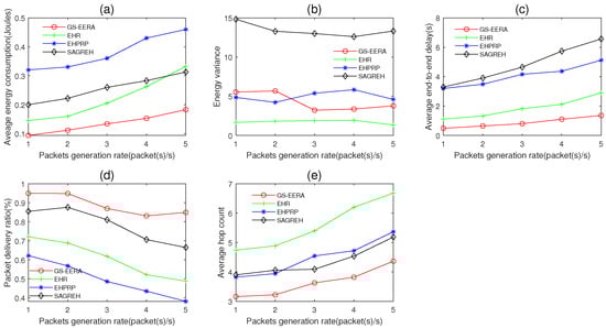 The impact of packets generation rate on (a) average energy consumption, (b) energy variance, (c) average end-to-end delay, (d) packet delivery ratio and (e) average hop count.