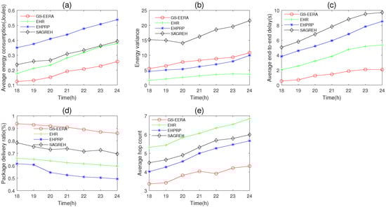In this simulation group, we set the energy harvesting time from 18 to 24 h (Figure 3), in which energy input from the photovoltaic energy harvester falls down drastically, to observe the performance change of the routing algorithms. We set the number of nodes , initial energy J, packets generation rate packets/s and data buffer capacity packets. Figure 15 shows the performance of average energy consumption, energy variance, average end-to-end delay, packet delivery ratio and average hop count change with time.