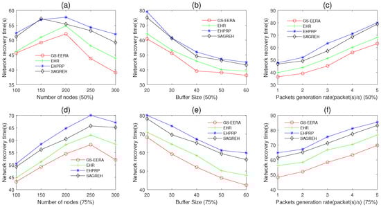 Figure 16d–f shows the performance of network recovery time when 75% of the nodes’ initial energy is 0. The changing trend is similar to Figure 16a–c, and GS-EERA still achieves the optimal performance. The reasons have been explained in Paragraph 2. However, overall, when the number of the node in which the initial energy is 0 adjusts from 50 to 75%, the network recovery time increases.