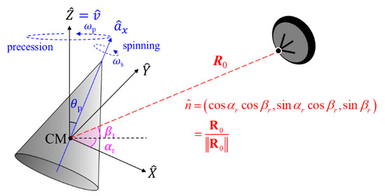 As is well-known, the space targets with a spin-motor precess so as not to deviate from their trajectory. To model these micro-motions (precession and spinning), the rotation axes should be defined. Figure 2 shows the geometry of a radar and a cone-shaped target with a micro-motion. The origin of the reference coordinate is assumed to be the center of mass (CM) of the target, and ωp and ωs are the scalar angular velocity for the precession and spinning about the Z-axis () and the target’s longitudinal axis (), respectively. Here, since the space target translates while precessing, it is assumed that the translation vector () is the same as the precession axis (), and θp denotes the precession angle which is the angle between the Z-axis and the longitudinal axis.