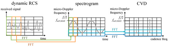 Figure 3 shows the conventional procedure of obtaining micro-Doppler signatures images. First, the dynamic RCS, which have complex values, is divided into short periods, multiplied by a window function, and Fourier transform is performed on each chunk. A spectrogram of a two-dimensional image is obtained by performing the fast Fourier transform (FFT) while sliding the window along the time axis. The CVD is obtained by performing an FFT along the time axis for all micro-Doppler frequency bins in the spectrogram. The perpendicular axis of the spectrogram and CVD is the micro-Doppler frequency shift, and the maximum value of the micro-Doppler frequency shifts is half the sampling frequency (fs). Therefore, the larger the pulse repetition frequency (PRF), the finer micro-Doppler frequency shift can be observed. Meanwhile, the maximum value of the micro-Doppler frequency (fmD,MAX) is the maximum value obtained from (3). For example, the maximum micro-Doppler frequency by the precession as shown in Figure 2 is given as follows:
