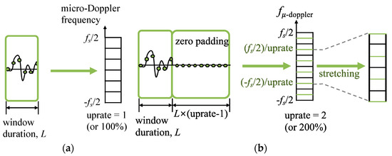Zero padding does not improve the frequency resolution, but it can have more frequency bins that are more closely spaced in frequency. When calculating the spectrogram, if the spectrogram image is stretched after performing zero-padding as much as the uprate of 1/cosβr, the micro-Doppler frequency resolution cannot be improved, but it can make it easier to visually resolve the stretched spectrogram pattern from the frequency-domain interpolation. Figure 4 illustrates the procedure of stretching the zero-padded spectrogram image according to the relative incident angle. Here, the uprate is set to 1/cosβr, and then the zero-padding length and image stretching rate are changed according to the relative incident angle to minimize an unnecessary increase in FFT calculation time.