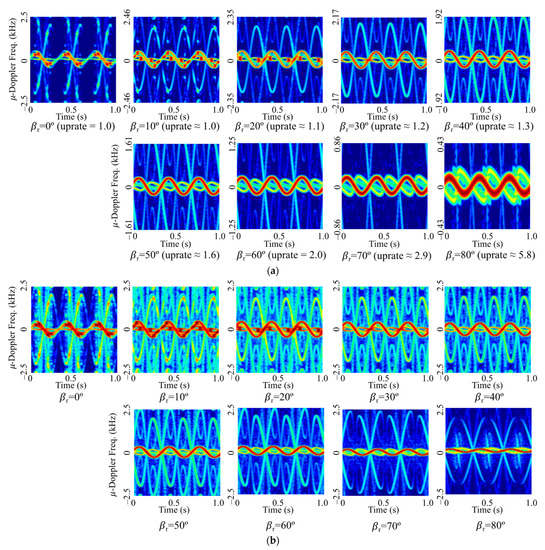 Figure 6 shows the spectrogram of the rounded cone for some incident angles when the rotation rate is 3 Hz. For the conventional spectrogram of Figure 6a, the larger the relative angle, the smaller the micro-Doppler frequency shift of the blunt tip. On the other hand, for the spectrogram by the proposed method of Figure 6b, the micro-Doppler frequency shift of the blunt tip is similar regardless of the incident angle. However, since the resolution does not increase even if the uprate is increased as the incident angle increases, the thickness of the micro-Doppler signal line increases and the pattern appears as if it increases. In addition, as the incident angle increases, the micro-Doppler frequency shift by both bottom surfaces increases, unlike the blunt tip, and has a value almost similar to the micro-Doppler frequency shift of the blunt tip. However, the field scattered by the bottom surface is smaller than that by the blunt tip, so the shape of the overall spectrogram is constituted by the blunt tip. Although the magnitude of the micro-Doppler frequency is not the same in the image, an increase in classification accuracy can be expected due to the similarity of the pattern of the blunt tip.