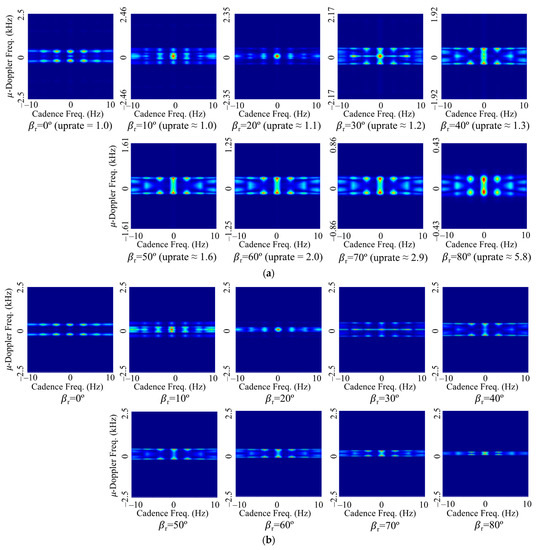 Unfortunately, patterns in a spectrogram are not one-dimensional data, and the micro-Doppler resolution is determined by the ratio of the sampling frequency, fs, to the number of FFT points. Therefore, even if the image shrunken in the transverse direction by the cosβr term is stretched again, the image is simply enlarged in the transverse direction due to having the same resolution.