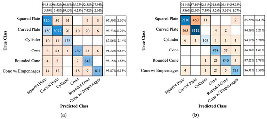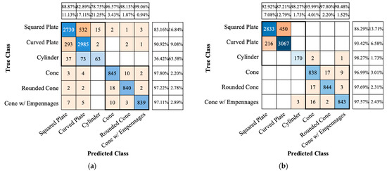Figure 9 shows the confusion matrices of ResNet-18 for the conventional and proposed CVD images. Similar to the accuracy performance using the conventional CVD images, when the proposed CVD images are used, the squared and curved plates are most often misclassified. However, it can be noticed that both the TPR and PPV of each true and predicted class are similar or higher than the performance of the conventional CVD. That is, it can be noticeable that the proposed CVD increases the classification accuracy.