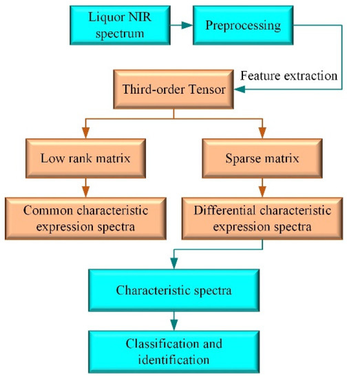 To date, although these technologies have the potential for quantitative and qualitative classification, they still cannot replace sensory evaluation for complex multi-component mixtures, such as liquor. The NIR spectral data of a sample generally contain three-dimensional attributes of the sample, spectrum, and class. However, PCA-based characteristic extraction can only process data in two-dimensional space, ignoring the implicit relationships in three-dimensional space. As a result, subtle differences between different classes are overwhelmed [28], which affects the accuracy of prediction. Conventional dimensionality reduction methods transform the data into a new coordinate system, where each new variable is a linear combination of the original variables. It can be seen that the new variable reflects the comprehensive effect of the dimensionality of the original data [29]. In this study, taking liquor as an example, the tensor robust principal component analysis (TRPCA) algorithm was used to mine the characteristic information of the NIR spectra among different classes in the three-dimensional space, and the spectral data composed of a few characteristic wavenumbers were retained. Therefore, the main characteristics of the sample can be obtained only by detecting the spectrum of the characteristic wavenumber band. The TRPCA algorithm is a key technique for handling high-dimensional datasets and aims to recover low-rank and sparse components accurately. Using the kernel norm, the TRPCA problem is solved with convex programming. It is often used in image noise reduction and image restoration research [30,31,32,33]. However, no study has reported the use of the TRPCA algorithm for detecting multi-component mixtures.