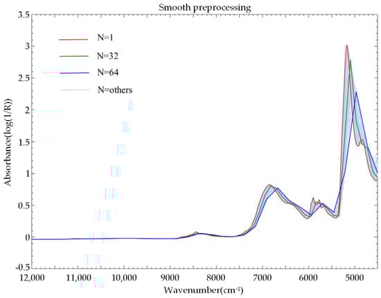 The smoothing pretreatment adopted the van smoothing method. Taking sample set II as an example, we selected the number of smoothing points N from 1 to 64, respectively, and obtained smoothed spectra (Figure 4). Among them, when the number of smoothing points was 1, it was the raw spectrum. As shown in the figure, as the number of smoothing points increased, the filtering effect also increased. The absorption peak shifted to the right, and the amplitude gradually decreased and became smoother.