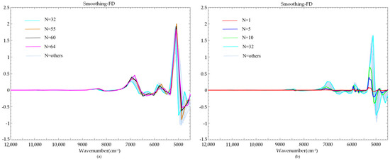 First derivative preprocessed spectra with different smoothing windows. (a) The smoothing window was between 1 and 32; (b) the smoothing window was between 32 and 64.