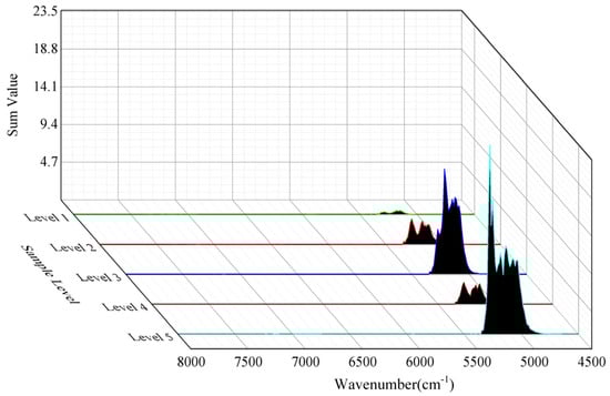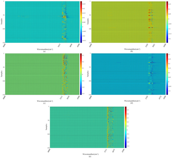 The low-rank tensor mainly contained common expression characteristics, and the differential expression characteristics (scattered points in Figure 6) were mainly concentrated in the sparse tensor. The sparse tensor was used to extract the difference in characteristic information in the NIR spectra of different classes of liquor. The smoothing window was set to 23 as an example. Figure 7 shows the heat maps of the sparse matrices of five classes of liquor. The differential expression wavenumbers were concentrated in the bands of 5415–4894, 5345–5201, 5311–5010, 5345–4732, and 5311–4975 cm−1. On this basis, the sparse matrices were further analyzed (Figure 8).