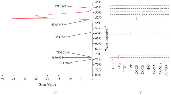 For each element in the vector Q, the filtering threshold was set to 0.2. The wavenumbers corresponding to the red curve in Figure 10a are the obtained characteristic wavenumbers. The absorption peaks at the characteristic wavenumbers constituted the characteristic spectrum. Table 2 shows the source of the main absorption band. According to Table 2, Figure 10b shows the main groups of the characteristic spectrum, including methyl (CH3), methylene (CH2), alcohol group (ROH), benzene ring (Ar.), carboxyl group (-COOH), ester group (-COOR), imide group (CONH), primary amide group (CONH2), secondary amide group (CONHR), and inorganic water (H2O). The analysis results show that the characteristic information of the NIR spectrum of liquor could interpret the coordination effect of the above groups.