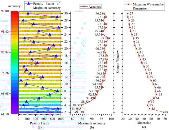 (a) Distribution of classification accuracy under different configurations of the smoothing window and penalty factor; (b) maximum classification accuracy of different smoothing windows; (c) characteristic wavenumber dimension of different smoothing windows.
