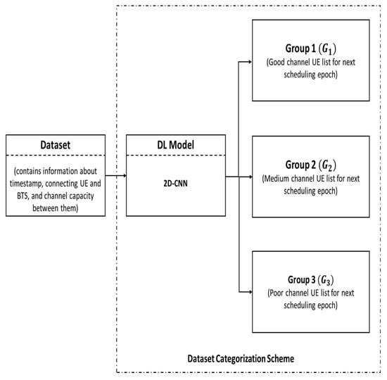- In the first part, a deep learning (DL)-based data categorization (DLDC) scheme is proposed to categorize the wireless dataset , which contains the timestamp, information about the connecting UEs, information about the base transceiver station (BTS), and information about the channel capacity between the connecting UEs and the BTS, into three different groups. The categorization is performed on the basis of the channel capacity between the connecting BTS and UEs.