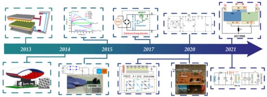 Brief timeline of the switching power management methods for triboelectric nanogenerator (TENG). Reproduced with permission [59]. Copyright 2013, American Chemical Society. Reproduced with permission [60]. Copyright 2015, IOP science. Reproduced with permission [61]. Copyright 2015, Nature. Reproduced with permission [62]. Copyright 2015, Nature. Reproduced with permission [63]. Copyright 2017, Elsevier. Reproduced with permission [64]. Copyright 2020, Nature. Reproduced with permission [65]. Copyright 2020, Nature. Reproduced with permission [66]. Copyright 2020, Elsevier. Reproduced with permission [67]. Copyright 2021, Nature. Reproduced with permission [68]. Copyright 2021, Elsevier.