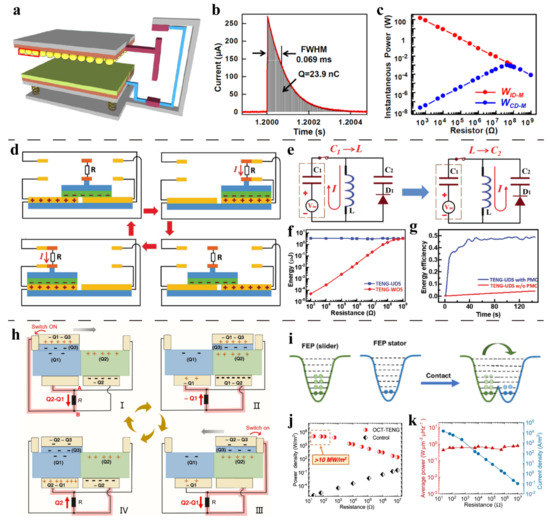 Qin et al. [69] designed a rectified travel switch. The structure is shown in Figure 3d. The load only contacts the electrode at the end of the reciprocating stroke, which can not only greatly improve the output energy but also convert the AC continuous signal of TENG into a DC pulse signal. The energy storage circuit and the energy transmission process of the rectified travel switch are shown in Figure 3e. When the switch is closed, the TENG energy is first stored in the inductor and then stored in the energy storage capacitor C2. The energy stored in the inductor is 3.14 μJ. Compared with the single cycle output energy under resistive load (3.33 μJ) (Figure 3f), the inductance loss energy is about 5.7%. The overall energy storage efficiency can eventually reach to 48% (Figure 3g).