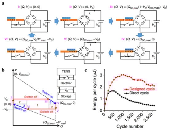 According to the theoretical analysis of V-Q curve, Zi et al. [70] confirmed that the single-cycle energy storage efficiency of TENG can be effectively improved (from a maximum of 25% to a maximum of 50%) by setting a switch connected in parallel with TENG and closing it at the two ends of the travel (Figure 4a). The reason is that at the end of each half-cycle, a portion of the charge remains in the electrodes to balance the voltage of the energy storage capacitor and the turn-on voltage drop of two diodes. By applying the above method, the remaining charge can be completely transferred to obtain more transferred charge in the next half of the cycle. The energy cycle curve has two more efficient regions (numbered 2 in Figure 4b) than the case without the switch (numbered 1 in Figure 4b). Experimental results show that the managed energy output is higher than rectified direct charging (Figure 4c) in most energy cycles.