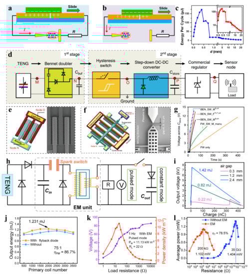 - Wang, Z.; Tang, Q.; Shan, C.; Du, Y.; He, W.; Fu, S.; Li, G.; Liu, A.; Liu, W.; Hu, C. Giant performance improvement of triboelectric nanogenerator systems achieved by matched inductor design. Energ. Environ. Sci. 2021, 14, 6627–6637. [Google Scholar] [CrossRef]