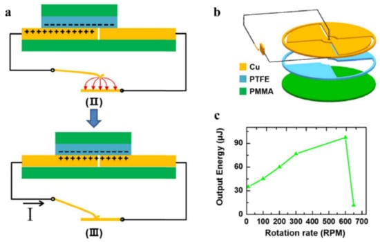 The authors connected the above-mentioned switch to the turntable TENG with a quarter grid and adjusted the speed (Figure 7b). A series switch that closes near the peak voltage (open-circuit voltage) extracts the maximum amount of energy from the TENG, so the switch can be managed optimally when the ratio of rotation frequency to switch vibration frequency is 0.25 (Figure 7c).