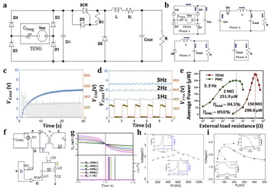 William Harmon et al. [66] designed a power management circuit based on a silicon-controlled rectifier (SCR) (Figure 8a). The energy flow in the circuit can be divided into four stages (Figure 8b). In the first stage, the electrical energy is stored in the capacitor Cin through the rectifier bridge. In the second stage, when the voltage in Cin reaches the reverse bias voltage threshold of the regulator D5, the current passing through can turn on the SCR, and the energy flows from Cin into the inductor L, the output capacitor Cout, and the resistor R. In the third stage, after all the energy in Cin is transmitted to the back end, the SCR cuts off, and the inductive energy continues to transfer to Cout and R. In the final stage, the energy in Cout is continuously consumed by the resistor R.