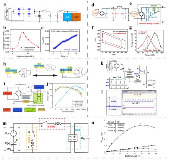 Madhav Pathak et al. [78] deduced the characteristics of charging battery using Full Wave Rectifier (FWR) circuit, Parallel Synchronous switched Harvesting on Inductor (P-SSHI) circuit and Series Synchronous switched Harvesting on Inductor (S-SSHI) circuit. (Figure 9m). The parameters studied include the following three: the energy output per cycle, the optimal battery voltage, and the maximum voltage that the battery can reach. Comparative experiment shows that whether the inductor is connected in parallel or in series in the loop, the energy storage effect of the battery is better than the FWR (100 times gain). The optimal load voltage of the S-SSHI circuit is not affected by the quality factor of the inductor and is smaller than that of the P-SSHI circuit. The author built a power management circuit to verify the theoretical derivation and simulation (Figure 9n). The generation principle of MOSFET control signal is the same as that in Song’s work [76]. The difference is that the author designed two independent contact-separation TENGs in order to avoid the mutual interference between energy harvesting and signal generation.