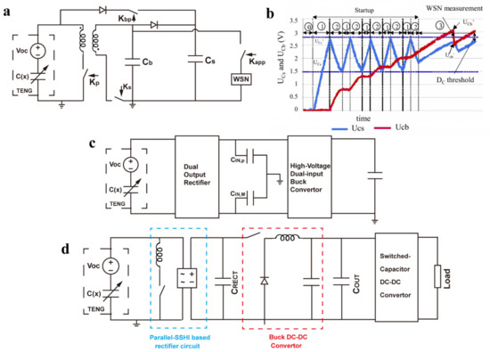 Ismail Kara et al. [81] designed a triboelectric energy harvesting circuit based on a synchronous inductor parallel switch and DC step-down conversion, which can convert 70 V input into 2 V DC output. The overall topology of the circuit is shown in Figure 10d. The circuit is composed of the following three step-down modules: synchronous inductance parallel switching rectifier circuit, DC step-down conversion circuit, and switched capacitor conversion circuit. When the voltage of capacitor Crect reaches 70 V, the step-down conversion is started, the voltage of Cout is stabilized at 10 V, and the load voltage is stabilized at 2 V. Similar to the idea of piezoelectric management, when the switch is closed at the time of zero-current the voltage can be reversed instantaneously, so as to avoid energy loss.