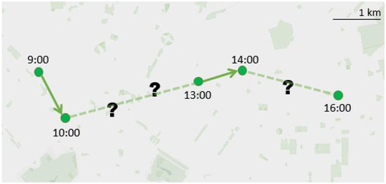 When dealing with this kind of mobility data, however, the primary issue is represented by the fact that their quality is rarely optimal, presenting, in most cases, a lack of completeness and a certain degree of information loss [23,24]. Trajectory recordings are indeed often characterized by temporary losses in the data collection, causing possible spatial–temporal gaps and missing trajectory segments [25,26,27]. These losses can be of various nature, namely depending on event-based recording modalities, ad hoc acquisition strategies, signal interferences, or technical malfunctioning [28,29,30]. Our research aims to find an effective way to properly fill these geospatial information gaps.