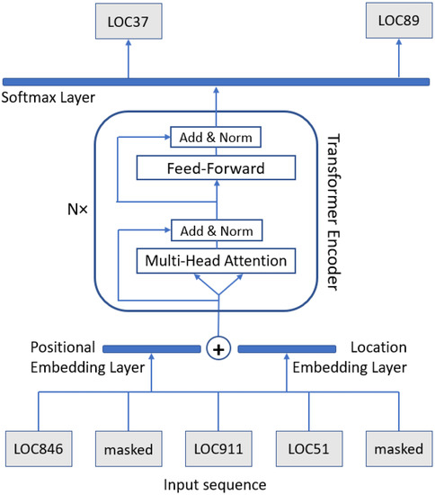 The BERT model design is based on stacking multiple transformer encoders on top of each other. The transformer architecture refers to the multi-head attention module that has shown substantial success in many vision and language tasks [40,45,46]. Each transformer encoder consists of two layers: a multi-head self-attention layer, and a position-wise fully connected feed-forward network. The attention layer encodes each element’s relations with every other element in the sequence, giving more importance to the most relevant ones; the feed-forward network then applies itself to each resulting element’s output vector parallelly. Overall, in our case, the process consists of determining the contextual relations between the locations in the trace, assessing their relevance and acquiring “semantic” information. Instead of looping multiple times over the input (as in the case of recurrent neural networks [47]), BERT uses multiple attention layers through which the information passes linearly. To address ordering issues, the transformer architecture encodes the position of a location along the sequence directly into a dedicated embedding vector, as a marker for attention layers. Indeed, in addition to the traditional entity embedding input representation as low-dimensional vectors of location identifiers, the further use of positional embeddings is provided. Since the multi-head attention layers are time-distributed (the output has a one-to-one correspondence with the input at the same index), they do not directly grasp the relative order of the elements in the sequence, but they only look at their relations; therefore, external positioning information is required to be added. Finally, the model includes also skip-level residual connections, to help information traverse in case of deep networks.