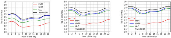 Top-1, top-3, and top-5 prediction accuracy scores (from left to right) over the 24 h of the day.
