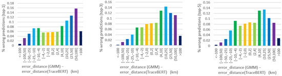 Finally, particular attention is directed to the analysis of prediction errors, targeting those cases when the model is not able to identify the correct missing locations. The outputs of TraceBERT were compared with GMM, the baseline with the best overall accuracy scores, to verify their error differences when both methods are mispredicting. Figure 4 depicts the bar graphs reporting the error distance distribution of the masked locations that are wrongly predicted by both approaches. The error distance of a top- prediction is calculated as the minimum distance between the real target and each of the predicted candidates. The figures suggest a clear trend of TraceBERT for prediction errors with a shorter error distance.