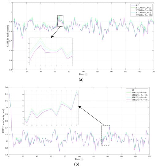 In case 1, the process and measurement noise are both Gaussian noises. Theoretically, KF should be the best estimator. To demonstrate the relationship between the KF and STKKF, these two filters were studied in this case. The ARMSE of the position and velocity estimates are listed in Table 1. Meanwhile, the average iteration number required for the STKKF to converge and the average implementation times of the filters for one time step are also listed. The iteration termination condition is given by Equation (24). Here, is set as . In addition, the RMSEs of the position and velocity of KF and STKKF with different kernel parameters are also plotted in Figure 1a and Figure 1b, respectively.