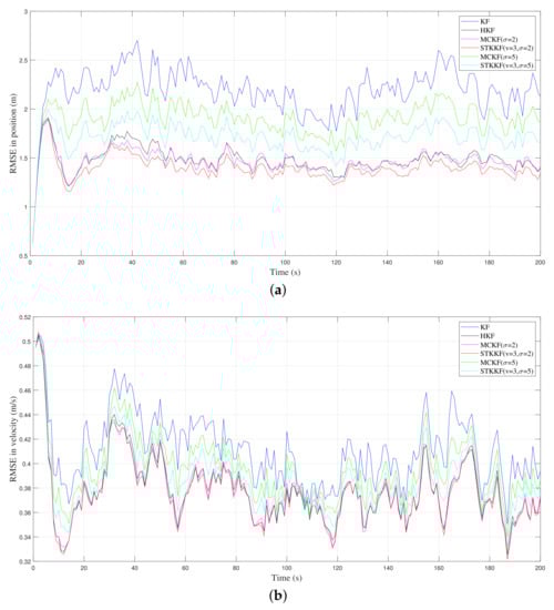 In case 2, the process noises are still Gaussian but the measurement noise is a heavy-tailed (impulsive) non-Gaussian noise, with a mixed-Gaussian distribution. The ARMSEs of the position and velocity estimate of different filters, average iteration numbers for MCKF and STKKF, and the average implementation times of the filters for one time step are listed in Table 2. In MCKF, the iteration termination parameter is set to be the same as that of STKKF, that is, . The RMSEs of the position and velocity of different algorithms are also plotted in Figure 2a and Figure 2b, respectively. It should be noted that for the MCKF and STKKF with different kernel parameters listed in Table 2, only partial models of them are plotted in the figures to maintain the clarity of the plot. It should be pointed out that the noise parameters of KF in the Table 2 are set with the true noise covariance of mixture distribution in Equation (55), and hence, KF is the best linear estimator in the MSE sense. The parameter used in the HKF is set to ensure that the best estimation accuracy is obtained.