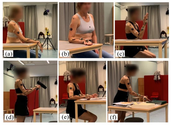 Before the experiment started, the participants were informed about the tasks that they would perform and were given the opportunity to test and familiarize themselves with the wrist movements. Two types of tests were included in the study to evaluate the IMU-based method against the goniometer: (1) standard wrist movements in three planes, i.e., flexion/extension, radial/ulnar deviation, and pronation/supination, at paces of 30, 60, and 90 beats per minute (bpm), following a metronome (Figure 2a–c); and (2) simulated work tasks, which involved different types of hand/wrist movements: blow-drying hair, folding paper planes, and sorting mail (Figure 2d–f). Each standard wrist movement was performed for at least 10 cycles and all in a sitting position by a desk. Each work task was performed for one minute at the participants’ own chosen pace. The blow-drying hair and sorting mail were performed in a standing position, whilst folding paper planes was performed in a sitting position.