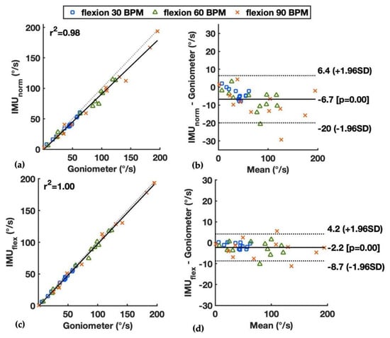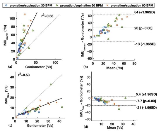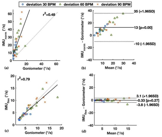Median wrist flexion velocity during wrist flexion/extension at paces of 30, 60, and 90 BPM measured by the goniometer and the IMU-based methods, showing by linear correlation and Bland–Altman plots: (a,b) the IMUnorm and goniometer; and (c,d) the IMUflex and goniometer. Squared correlation coefficients (r2) and limits of agreements are presented.