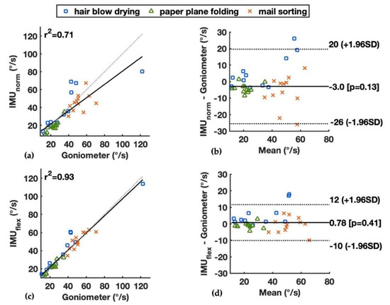 The wrist flexion velocity measured by the goniometer and two IMU-based methods and the mean absolute errors (MAEs) during simulated work tasks are shown in Table 2. The IMUflex had an overall better accuracy than the IMUnorm compared to the goniometer, with the MAEs of median wrist flexion velocity <5.8°/s for all work tasks, vs. <10.6°/s for IMUnorm (see Comparison of Methods, Table 2). The largest MAEs were observed during blow-drying hair for both IMU-based methods, whereas the smallest differences were observed during folding paper planes. The correlation and limits of agreement between the IMUnorm and goniometer during three work tasks are shown in Figure 6a,b, and those between the IMUflex and goniometer are shown in Figure 6c,d. The IMUflex had a high squared correlation coefficient compared to the goniometer (r2 = 0.93), a small bias of 0.78°/s, and limits of agreement of −10°/s and 12°/s. The IMUnorm had a lower squared correlation coefficient compared to the goniometer (r2 = 0.71), a bias of −3°/s, and larger limits of agreement of −26°/s and 20°/s.