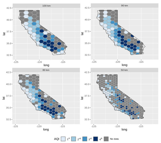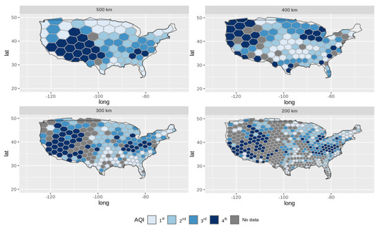 - Carr, D.B.; Olsen, A.R.; White, D. Hexagon mosaic maps for display of univariate and bivariate geographical data. Cartogr. Geogr. Inf. Syst. 1992, 19, 228–236. [Google Scholar] [CrossRef]