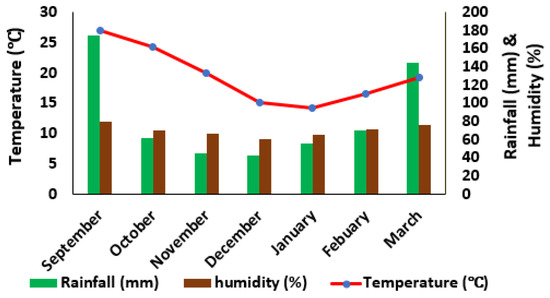 Average temperature (°C), rainfall (mm) and relative humidity (%) data recorded during the study period.