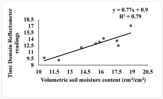 Figure 1 depicts the monthly mean temperature, relative humidity, and rainfall during the plant growing season. Figure 2 depicts the correlation between Volumetric water content (VWC) and Time Domain Reflectometer (TDR) revealing a strong correlation at R2 = 0.79. The coefficient of correlation between volumetric water content and TDR was observed to be improved in this study, proving that TDR equipment may be used solely to estimate soil water content in this type of soil with ease. The association between the VWC and TDR measurements was significant (p ≤ 0.05) after the statistical analysis. The findings of this study were comparable to those of [36,37] who reported R2 values ranging from 0.65 to 0.99 as the correlation coefficient between VWC and TDR.