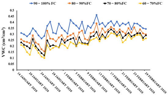 The amount of water in the soil was affected by irrigation regimens. The fluctuation in volumetric water content during the planting season is depicted in Figure 3. There was a reduction in water application with reducing in soil field capacity from 90–100% FC to 60–70% FC, resulting in the average highest and lowest soil water content values, for 90–100% FC, 80–90% FC, 70–80% FC, and 60–70% FC, respectively, over the growing season. The soil moisture content at 90–100% FC, 80–90% FC, 70–80% FC, and 60–70% FC treatments, however, varied significantly, especially when daily temperatures increase at which the crops needed more water for biophysical and physiological growth and development. These results conform to the findings of [14,38,39,40,41].