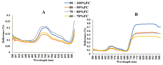 Figure 4A,B depicts the average spectral reflectance of choy sum leaves grown with different field capacities. The leaf reflectance varied depending on the irrigation treatments, demonstrating that water stress influenced leaf spectral characteristics for peaks near 545 nm, and 740 nm, for visible light and NIR regions, respectively. In this study, the spectral values from water-stressed and non-water-stressed plants were obtained from the visible spectrum region (380 nm to 648 nm) and NIR spectrum (701 nm to 980 nm) to estimate crop water status in choy sum. The reflectance wavelengths observed from choy sum leaves were similar to that of [3,13,42] who used narrow-band hyperspectral reflectance to estimate crop water status using VIs.