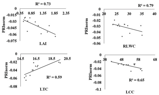 Relationship between PRInorm, leaf temperature, Leaf Area Index, Leaf Chlorophyll Content, and Relative Leaf Water Content found from the various treatments.