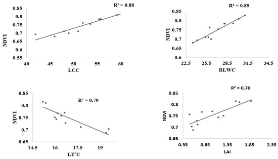 Association between NDVI, leaf temperature, Leaf Area Index, Leaf Chlorophyll Content, and Relative Leaf Water Content found from the numerous treatments.