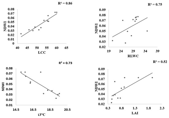 Association between NDWI, leaf temperature, Leaf Area Index, Leaf Chlorophyll Content, and Relative Leaf Water Content found from the numerous treatments.