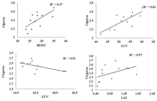 Association amongst CLgreen, leaf temperature, Leaf Area Index, Leaf Chlorophyll Content, and Relative Leaf Water Content obtained from the various treatments.