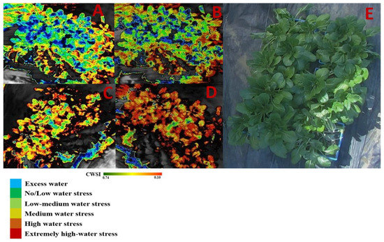 Spatial and temporal changes of CWSIW. Spatial distribution of CWSIW obtained from Workswell Wiris Agro R Infrared Camera at (A), CWSIW 90–100% FC (B), CWSIW 80–90% FC (C) CWSIW 70–80% FC, (D) CWSIW 60–70% FC, and (E) is the RGB digital image of choy sum.