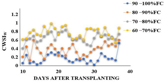 Figure 9 illustrates the spatial and temporal changes in CWSIW recorded from the Workswell Wiris Agro R infrared camera and evaluated with the CorePlayer version 1.3.8. Figure 10 also revealed the CWSIW values changes at different soil field capacities during the growing season. This experiment found a substantial association between CWSIW and water stress indicators on choy sum leaves, with R2 values above 0.65 at each growth stage. This is linked to the stages of leaf growth, flower development stage, and chlorophyll pigment formation, during which the plant consumes a lot of water for biochemical and enzymatic processes. However, Figure 11 demonstrated a significant association between CWSIW and LT °C, LRWC, LAI, and LCC at R2 = 0.71, 0.68, 0.71, and 0.65 for all color modes employed at each growth stage of choy sum development. The empirical and theoretical modes of the Workswell Wiris Agro R Infrared Camera, according to Alordzinu et al., (2021) [2], are capable of estimating water stress at a height of 4–10 m, and this was related to vegetable plants. When there is little vegetation on the soil surface, however, the majority of remote sensing reports display a greater percentage of varied pixels [2,15,21]. Crop traits, not soil conditions, have the greatest influence on CWSIW [2,21,47,48] These findings show that utilizing the Workswell Wiris Agro R Infrared Camera to approximate crop water stress index in choy sum is both accurate and quick. This study’s findings are equivalent to those of [2,49].